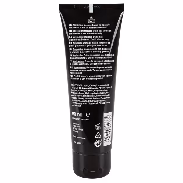 Den veganska penismassagecremen XXL innehåller jojobaolja, vitamin E och ginkgoextrakt. Det är också bra för näring före eller efter sex. Massera bara in den i penis (eller låt en partner göra det) – krämen kan användas så mycket som någon vill.