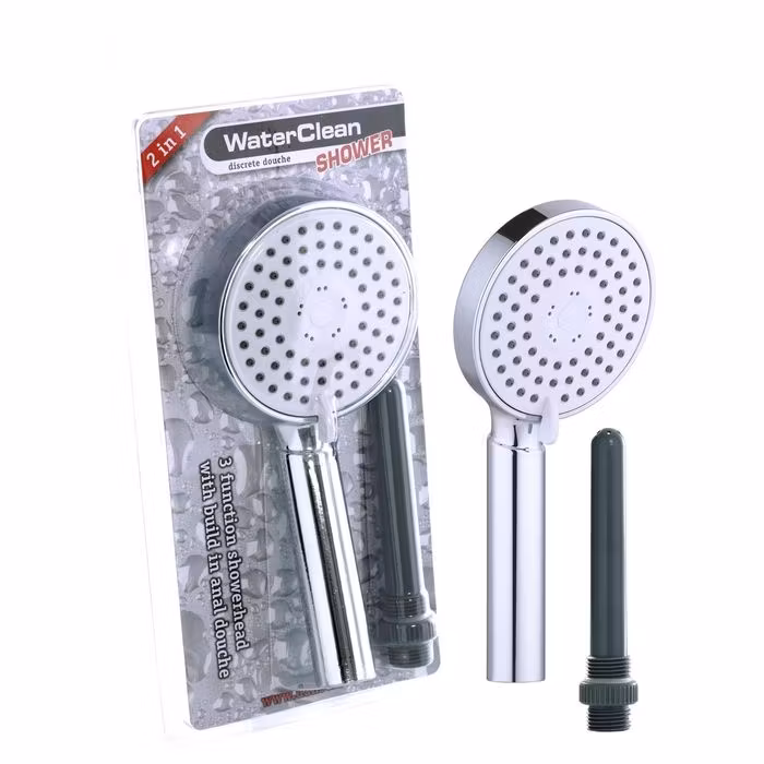 Högkvalitativt duschhuvud med 3 funktioner och inbyggd analdusch. Det perfekta sättet att få snabb tillgång till anal rengöring utan att behöva byta mellan vanligt duschhuvud och duschhuvud. Dessutom, när någon kommer till ditt badrum, kommer de inte att se att du använder en analdusch eftersom den är diskret gömd i handtaget på en vanlig dusch. Levereras med standard 1/2 tums gänga, packning och extra O-ring. Analdusch mått 10 x 1,7 cm.