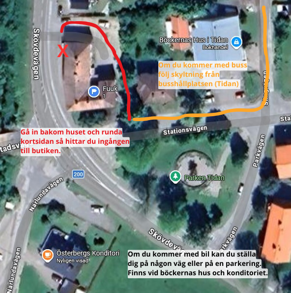 Ett vägarbete har påbörjats utanför butiken i Tidan, men det är inga som helst problem att komma in i butiken. Däremot kan det vara lite kruxigt att parkera. Men det finns ett par parkeringar bara 100 meter från oss. Vi har märkt ut dom på kartan med "P". Det går även parkera inne på gården, men kan bli trångt.Bussar går som vanligt, men hållplatsen har flyttats 50 meter. Vägarbetet ska pågå till 26 april.