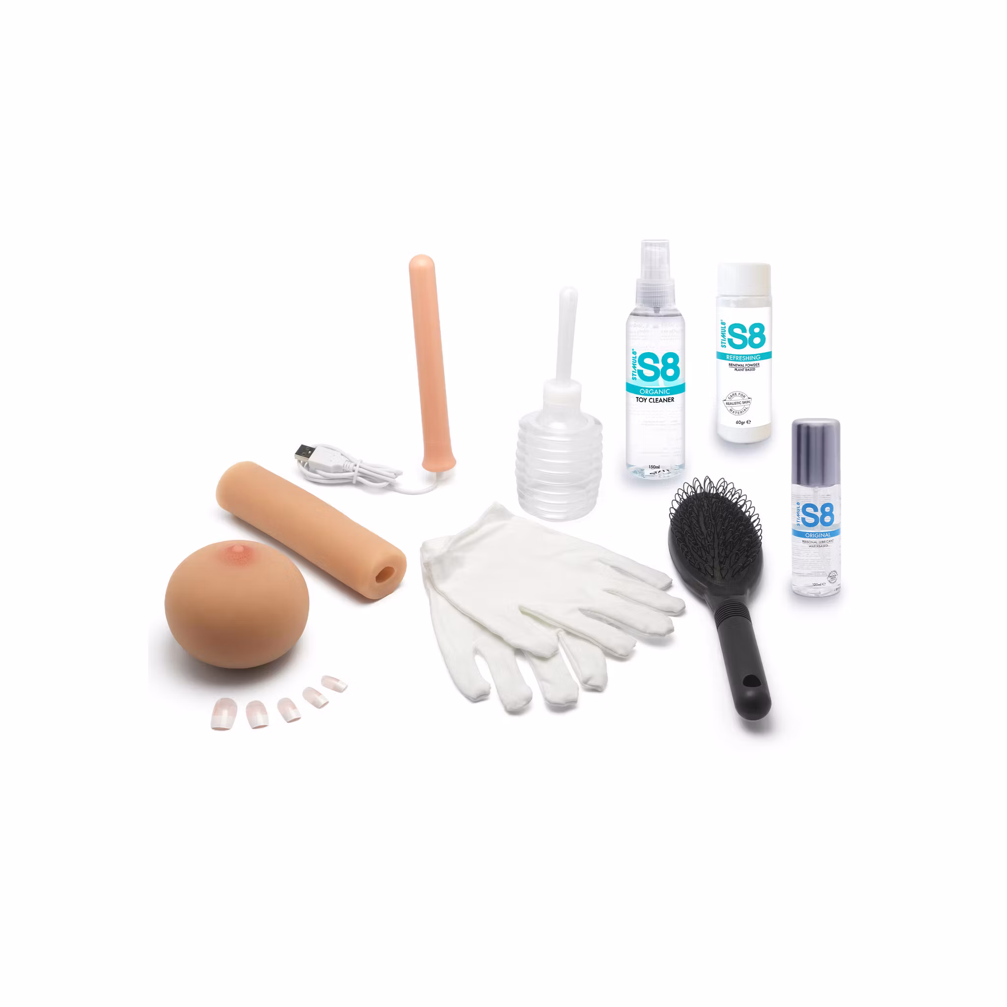 Helen levereras med ett lyxigt tillbehörsset, inklusive två underklädesset, S8 leksaksrengöring, silkeslent glidmedel, förnyelsepuder, vita bomullshandskar, ersättningsnaglar, en USB-värmepinne, en rengöringssköljapparat, en hårborste och omfattande skötselråd.