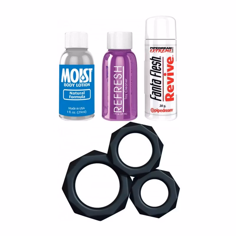 Perfekt storlek för att hållas och användas med bara en hands hjälp. I förpackningen ingår 3 potensringar i olika storlekar utan extra kostnad, samt även glidmedel, rengöring och puder. Efter tvätt och lufttorkning pudras produkten med ett tunt lager för att återfå "nykänslan" i materialet.