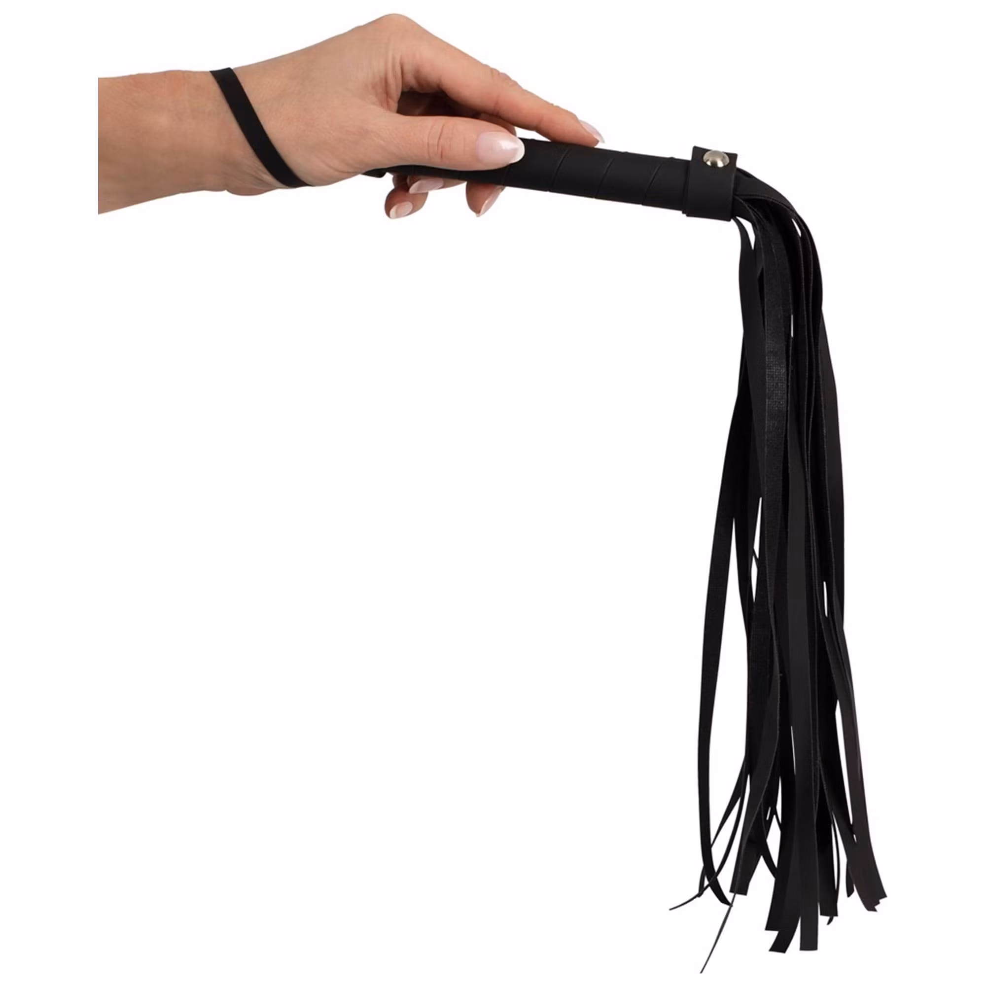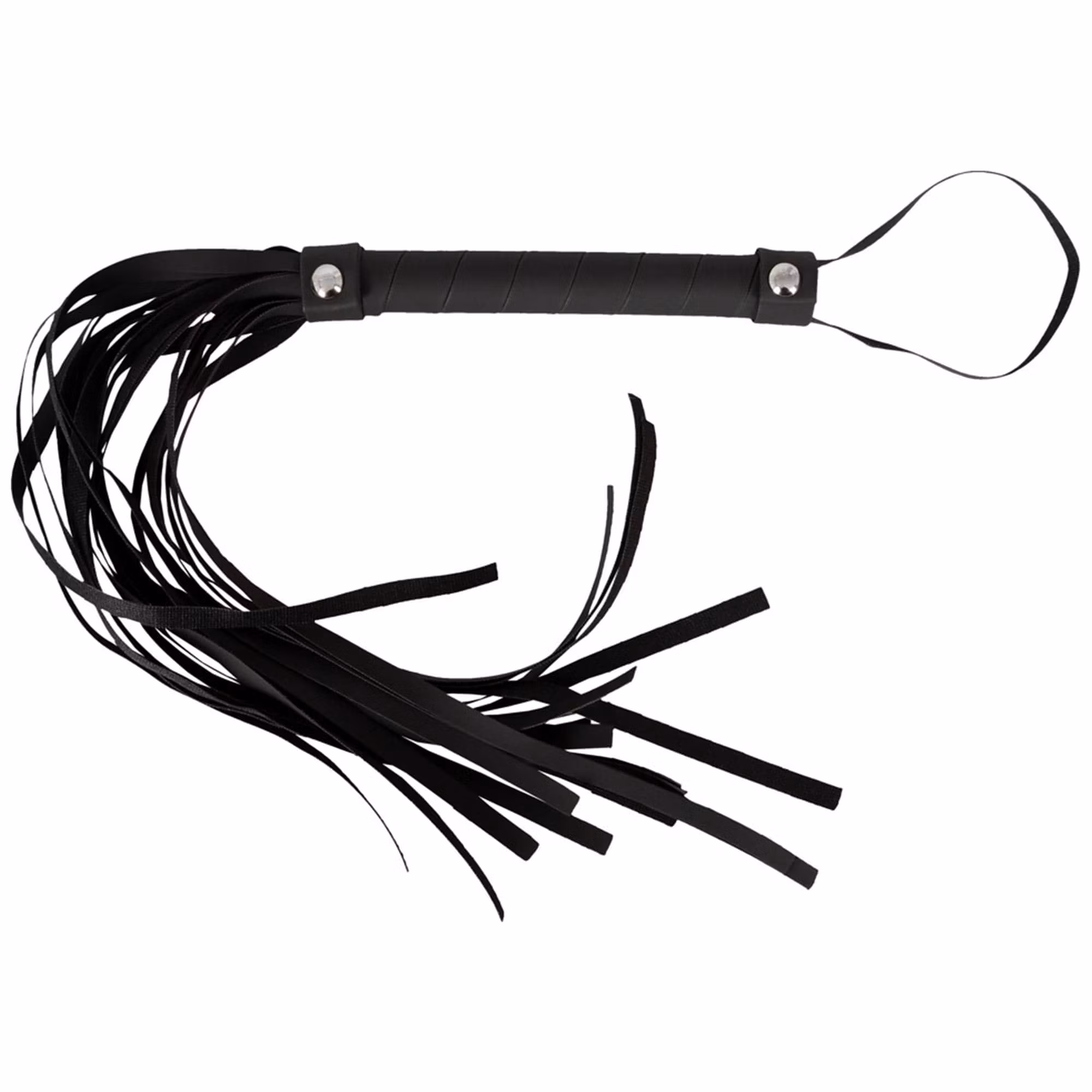 Svart flogger med lindat handtag och en praktisk ögla för ett stadigt grepp. De mjuka fransarna kan användas för sensuella smekningar eller sexigt smisk.