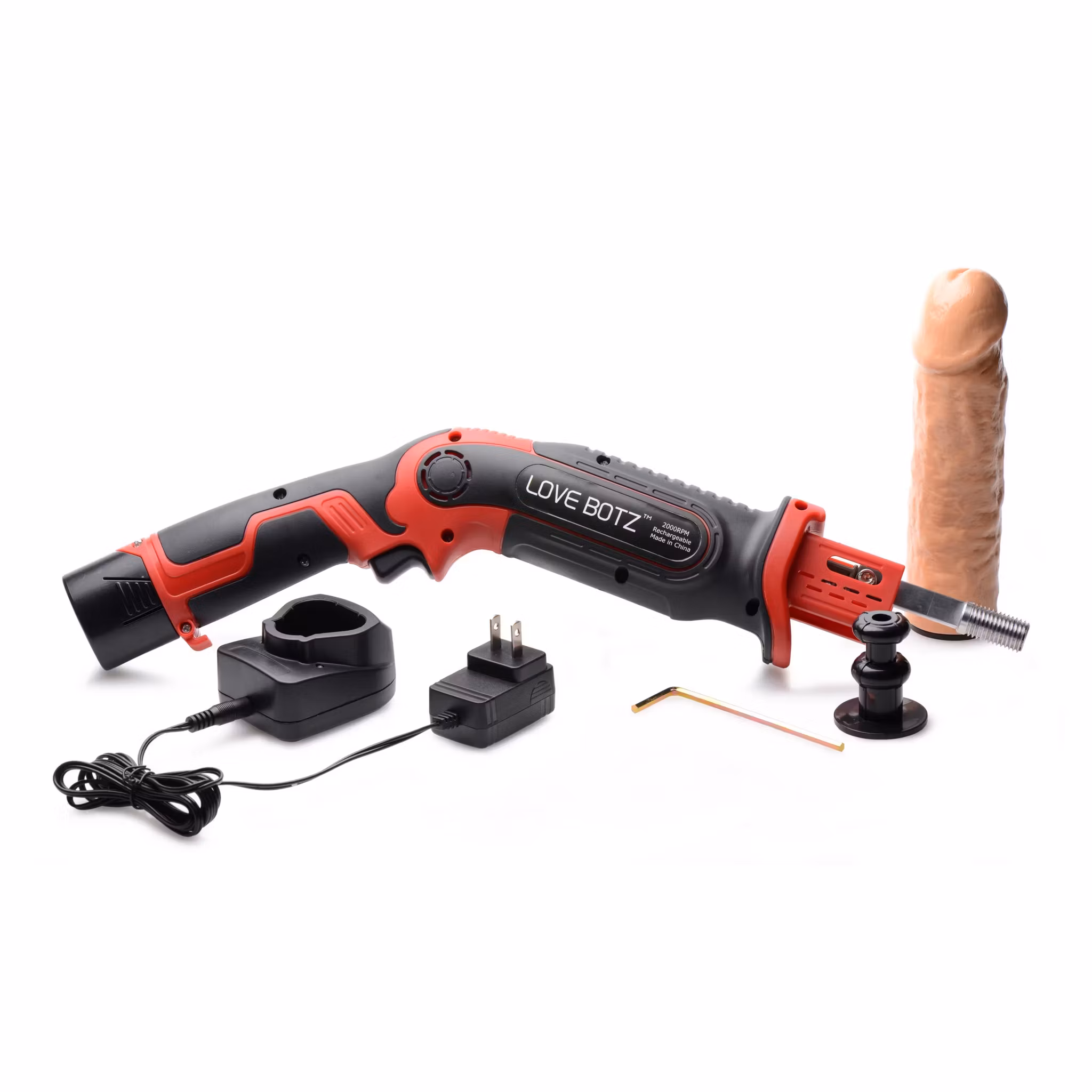 Obs: Inkluderar Lovebotz fram- och återgående såg, uppladdningsbart batteripaket med laddningsdocka, metalladapterstång, dildoadapter med vakuumgrepp, böjbar dildo, insexnyckel och bruksanvisning. Strokerfäste ingår ej.