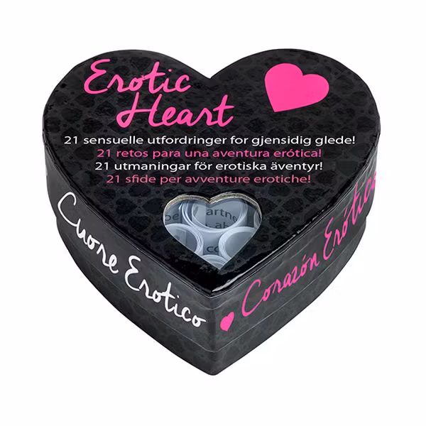 Det erotiska hjärtat är en hjärtformad låda med 21 inbjudande utmaningar för dig och din älskade. Dess nätta storlek gör det lätt att ta med sig. Lägg det under en kudde, i en picknickkorg eller överraska med det under en romantisk middag! Skäm bort dig själv och din älskade med detta hjärta fyllt med erotisk inspiration. Glöm inte spana in hela samlingen med hjärtan i Tease & Please kollektionen.Spänning och njutning garanteras!