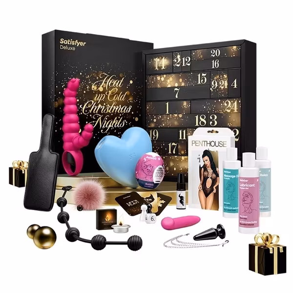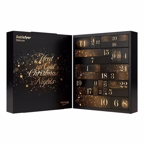 Adventskalender Deluxe version från varumärket Satisfyer. Njut av julens ankomst på det mest lyxiga och njutbara sätt! 24 sexleksaker för dig att upptäcka, med ett totalt värde av mer än 600 Euro!!! I kalendern hittar du dessa leksaker: klitorisstimulator, äggonani, silikonvibrator, vibrator med platt spets, kroppsdräkt, spanker, massageljus, vattenbaserad stimulerande gel, massageolja, spetsmask, erotisk lek, mini fingervibrator , anal dildo, cockring, silikon handbojor, anal pärlor, deluxe bondage tejp, penis slida, nippelklämmor, fjädertickler, räfflad anal dildo, vattenbaserat analt avslappnande glidmedel, sfärisk cockring och fördröjningsspray. Men kan du bara öppna en per dag... kommer du att lyckas att inte fuska?