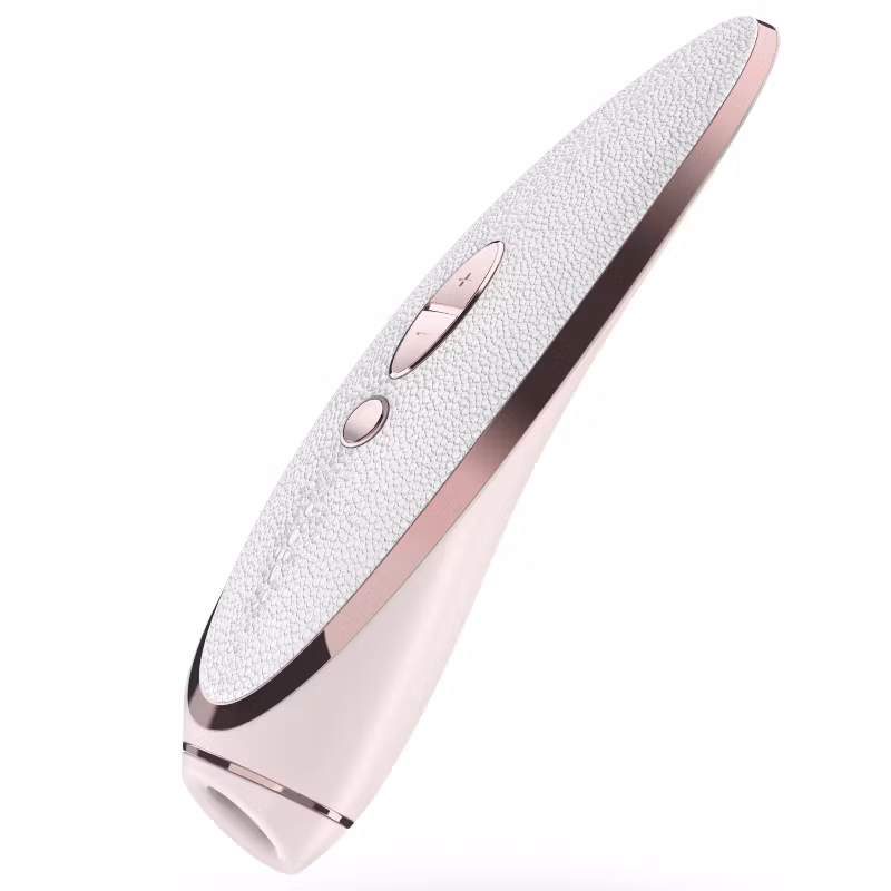 På ett smidigt och elegant sätt omger ringen av ultramjuk flytande silikon av medicinsk kvalitet din njutningspärla och smeker den med den vanliga hisnande Satisfyer-tryckvågsstimuleringen. Dess intuitiva kontroller låter dig välja dina favoriter från 11 olika intensitetsinställningar och njuta av den himmelska känslan av beröringsfri klitorisstimulering. Den ergonomiska formen på Satisfyer Luxury Prêt-à-porter ligger bekvämt i handen, medan den raffinerade ovandelen i sensuellt strukturerat läder får dig att känna dig som en drottning. De roséguldfärgade elementen gjorda av ädelmetall och den silkeslena, matta kroppen i ömt rosa kompletterar den lyxiga designen perfekt.